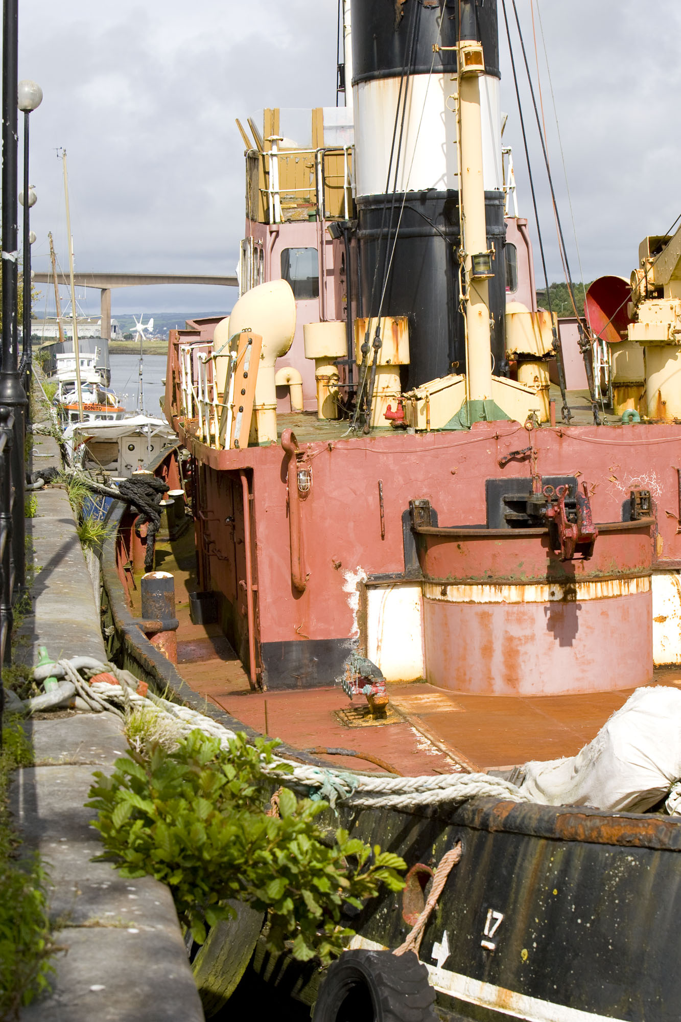 A tug that doesn’t seem to have worked in quite a while. It’s propeller was firmly stuck in the mud and weeds were growing along it’s mooring ropes.