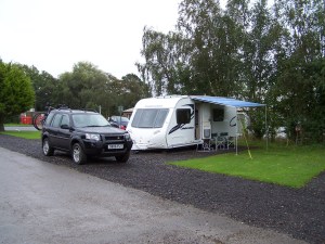 So caffeine and calorie levels restored – did I mention the pannini? We set off again. We made good time and pulled into the site at about ten past twelve in a queue behind a caravan and motor home. By the time I’d put the hand-brake on another caravan had pulled in behind us. The chap got out and managed what could only be described as a geriatric sprint past us to get to the reception desk before us. I guess he thought he was on a Caravan Club site and had to be the first so they could get the best pitch. Ho Hum.