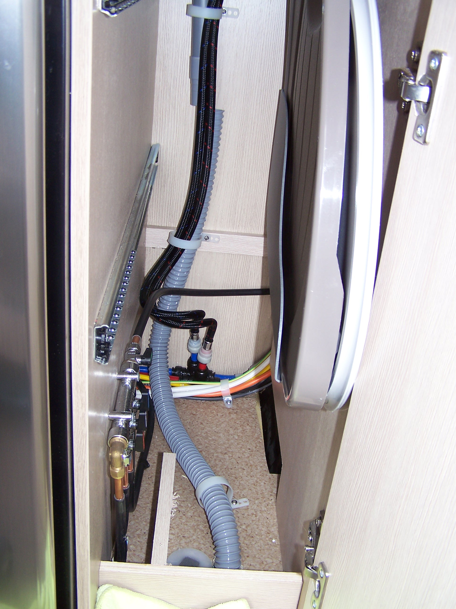 I removed the slide out baskets and the false floor of the cupboard to reveal the problem. The flexible pipe had parted from the ridged pipe and allowed water draining from the sink to flood the floor of the cupboard and drain through next to the wheel arch.