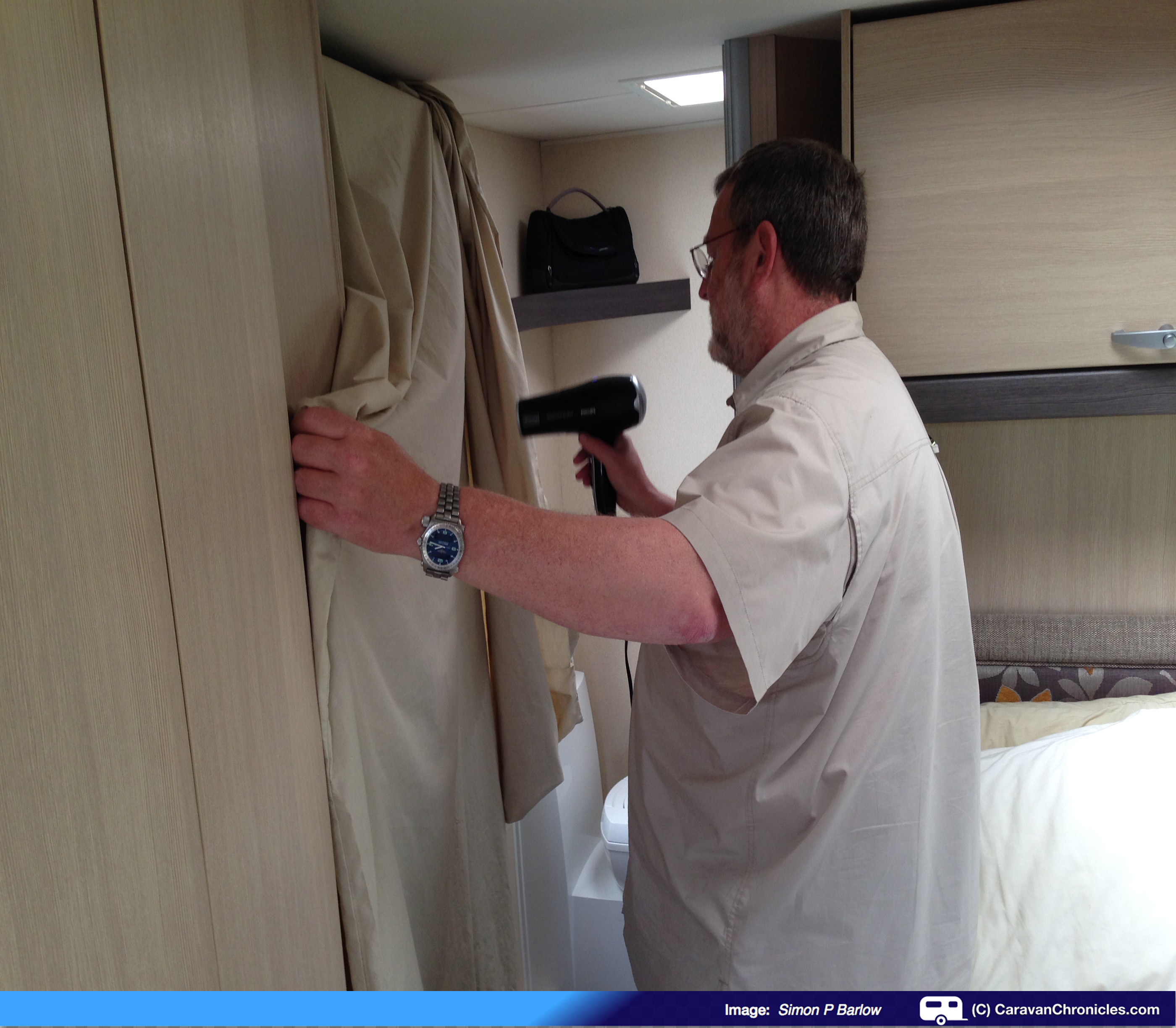 Sue asked me if I had closed the roof vent over the bed…. DOH!. It was then I discovered that the rain had been driving along the roof of the van and had entered the roof vent above the bed and we now had a rapidly growing puddle on the duvet!. Shutting the roof vent stopped the flow of water and using a towel to stem the drips partly solved the problem of dripping water. However, the duvet cover was soaking. We stripped the cover off the duvet and a big thumbs up to the Jonic duvet… it shed water quite easily, the hollow fibre filling seemed not to be wet. First thoughts were to see if the site had a tumble dryer… then I had an idea. Sue has a hairdryer that I think in a previous life was a hot air paint stripper. Throwing the cover over the bathroom door and giving it 10 minutes of going over with the hair dryer set to “blast furnace” sorted it out… dry as a bone. The actual duvet wasn’t too bad and a further couple of minutes work with the hair dryer again had it feeling like it had been pegged out in Death Valley. The roof vent needed some attention now… just as the rain had stopped. A good wipe down with a towel got most of the water but the fly screen seemed to hold on to it and it was like looking up at a swimming pool. The hair dryer trick worked again and 30 minutes after discovering it everything was dry again. It’s a good job we decided to come back to the caravan for lunch or it could have been soaking in for a good few hours. Lesson learnt… shut the bloody vents when we go out!