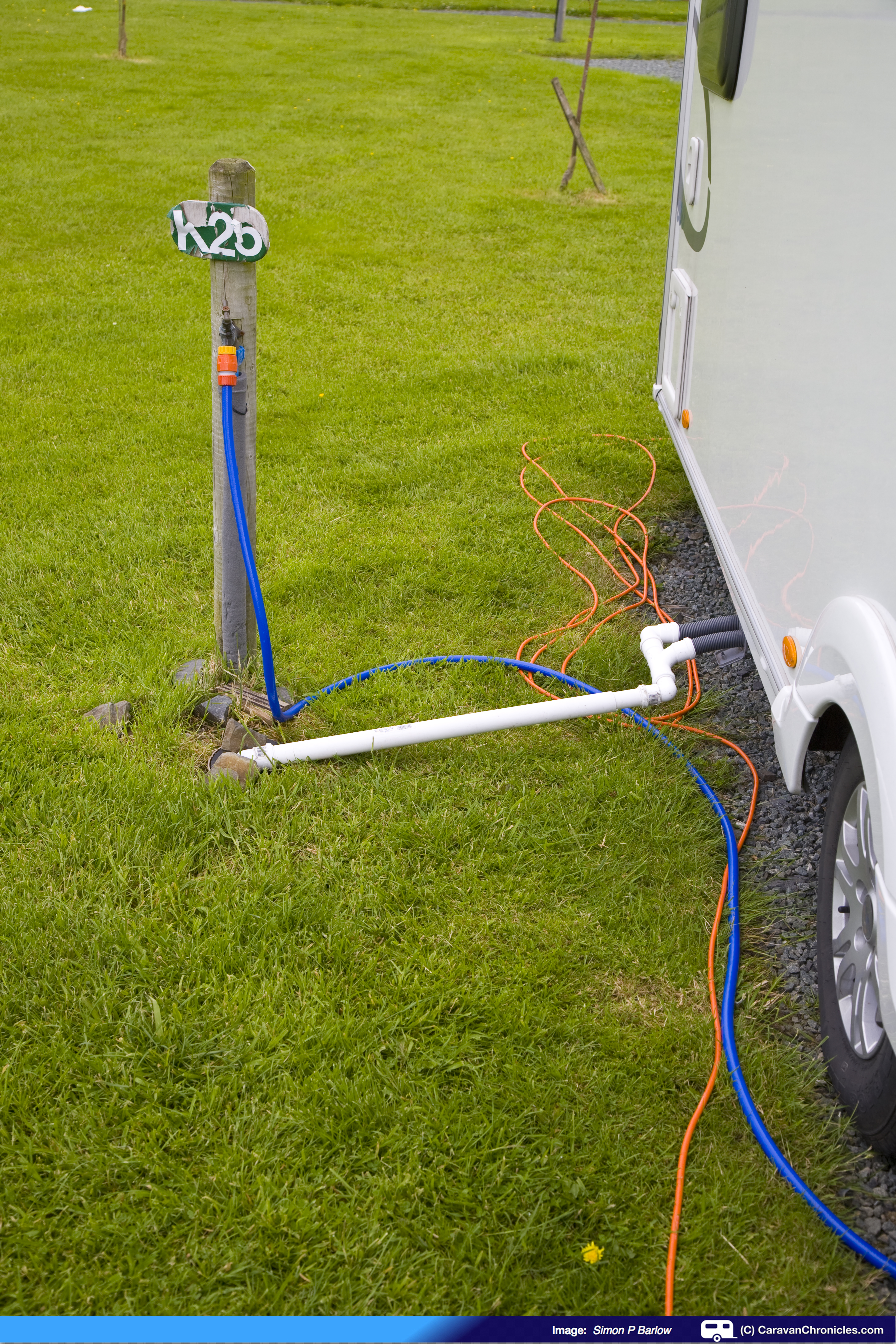 The pitch was a fully serviced pitch and the tap and drain conveniently lined up nicely at the side of the caravan and allowed quick and easy connections. (To see how we easily connect the drainage on serviced pitches see “Connecting your drainage on serviced pitches…“) The 16 Amp EHU was a little further away and the 10 metre lead wouldn’t quite reach so we had to use our 25 metre EHU lead. The pitch was level side to side and sloped down gently towards the front but two or three turns on the jockey handle soon sorted that out!