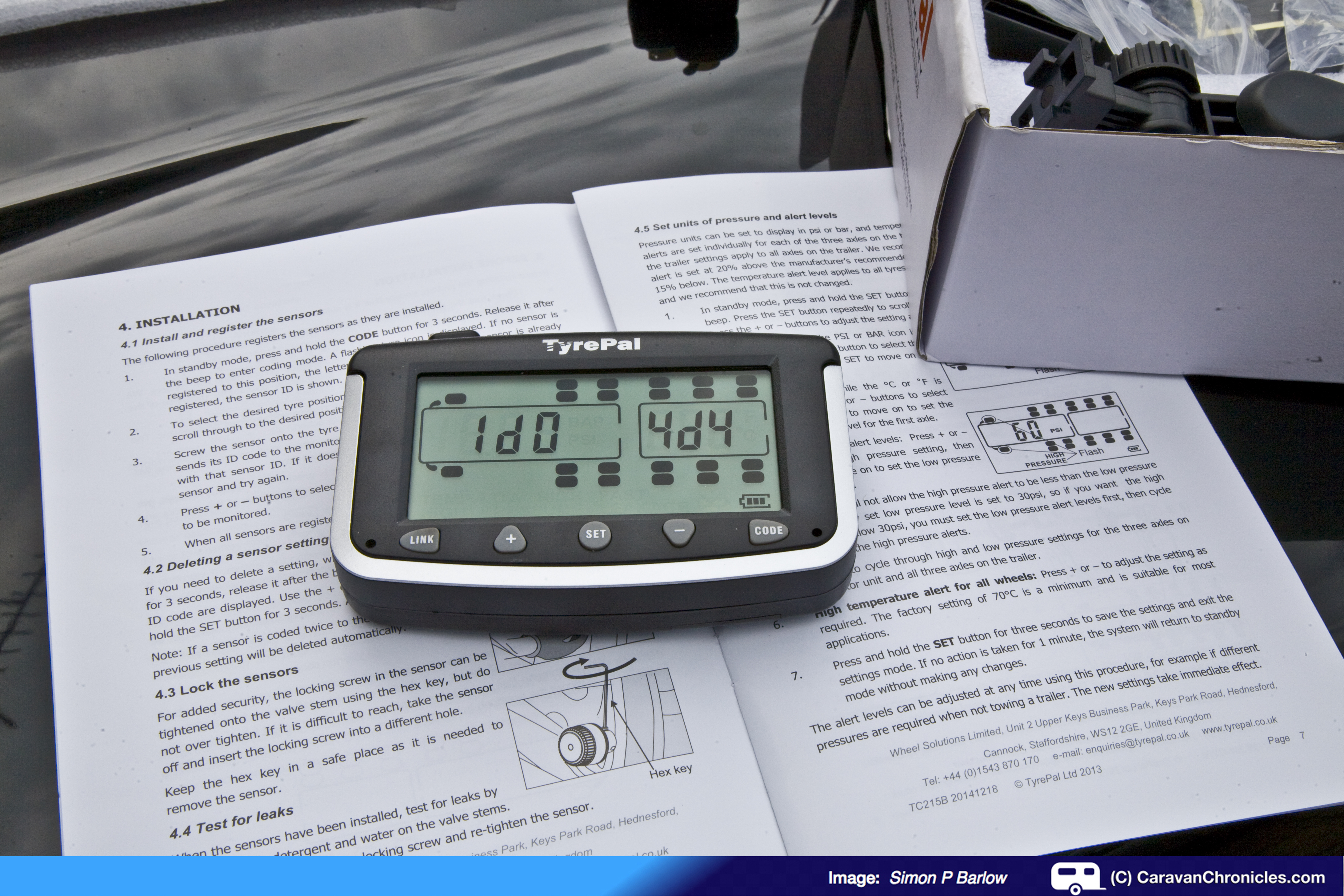 Step two: lay out everything you need out of the box, and have another read of the instructions. The TC215B unit can monitor up to 22 pressure sensors and will allow you to configure tag axle motorhomes, twin wheel vans and up to three twin wheel axles on a trailer. So that should just about cover any combination imaginable. The sensors are interchangeable and can be registered at any of the 22 positions. Once all the sensors have been registered, only the tyre positions used are displayed. In standby mode press and hold the ‘CODE’ button for three seconds and release it after the beep….
