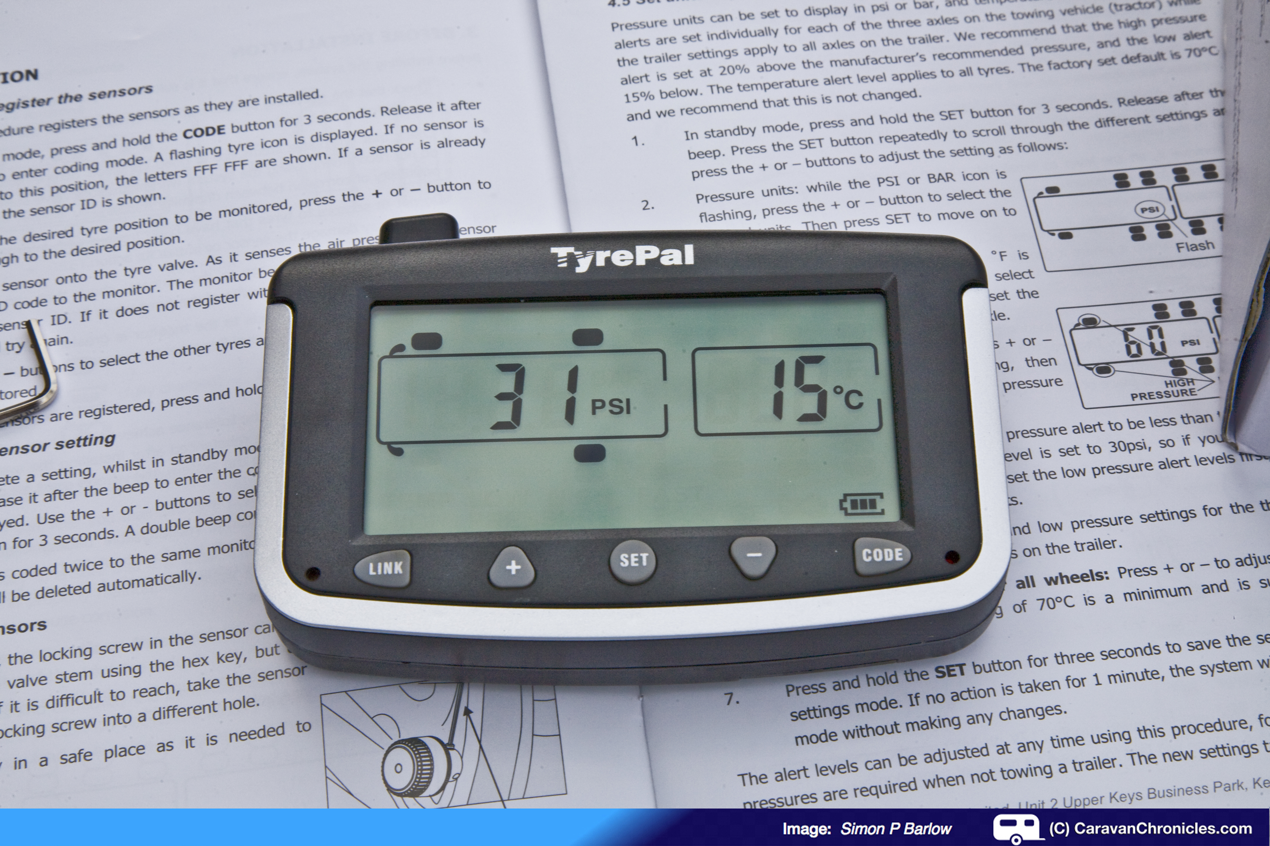 Step three: Well there isn’t one – it’s that simple to install. The only other thing you need to do is set the high and low pressure alarms and high temperature alarm which again is really easy to do. The instruction booklet takes you through this and a recommendation of setting the high value at 20% above the recommended pressure and 15% below. Likewise setting the temperature alarm is simple but I left it at the factory default of 70’C. The only other thing to do is check for leaks and tighten up the lock screws on the sensors. Conveniently there are 4 positions the lock screws can be located and you might need to move the screws into different positions depending on the wheel rims. In practice on both the Freelander wheels and the Sterling caravan wheels I didn’t need to reposition any of them.