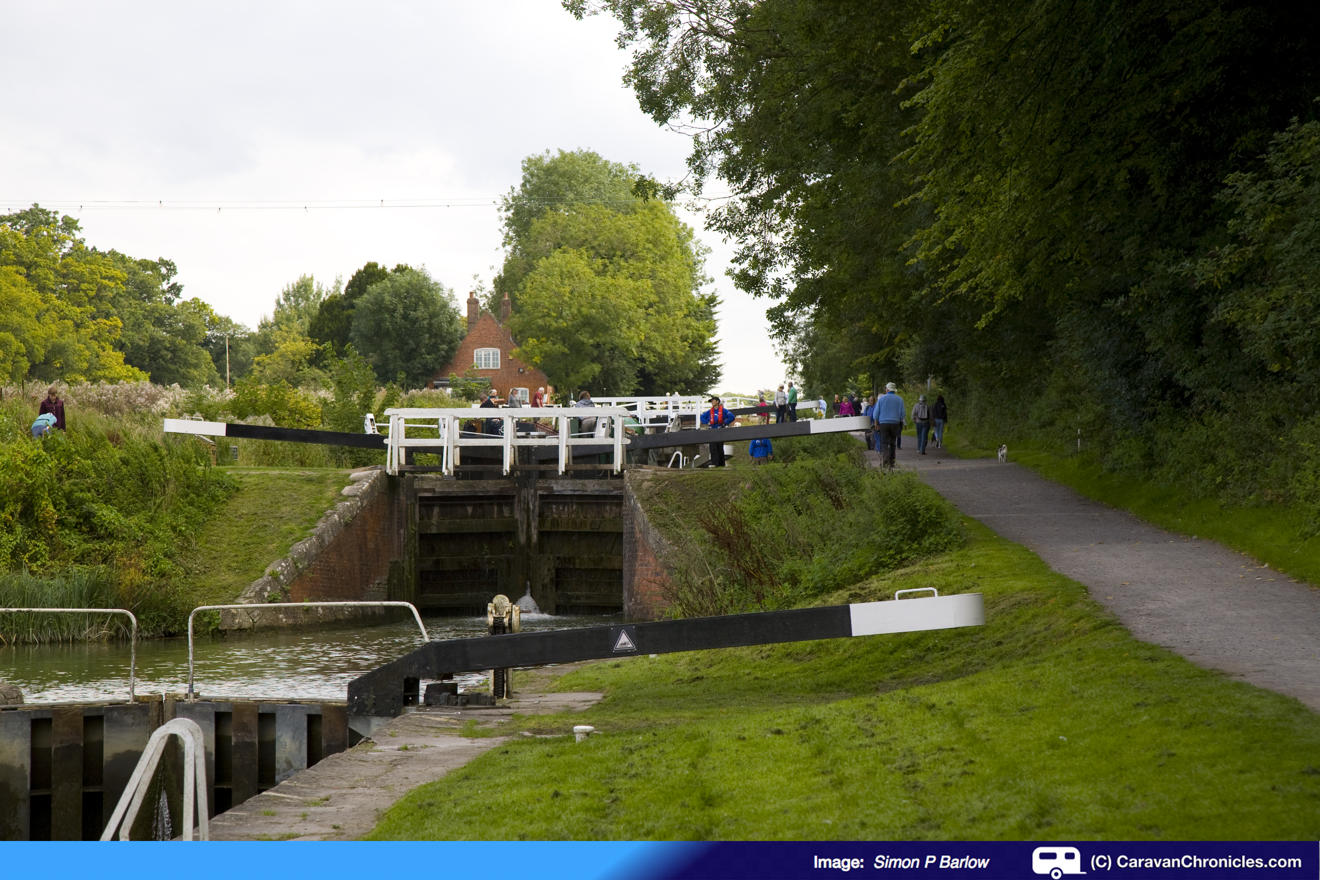 The famous Caen Hill Locks are a flight of 29 locks on the Kennet and Avon Canal. The 29 locks have a rise of about 230 feet in 2 miles and come in three groups. The lower seven locks, Foxhangers Wharf Lock to Foxhangers Bridge Lock, the next sixteen locks form a steep flight in a straight line up the hillside. A final six locks take the canal into Devizes. The locks were designed by engineer John Rennie and provided a solution to climbing the very steep hill. Apparently the locks take 5–6 hours to traverse in a boat and lock 41 is the narrowest on the canal or so we were told.