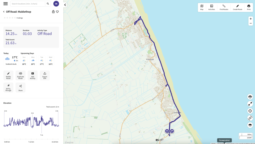 Apart from a couple of days the weather was blueish skies and warm for September which allowed up to get a bit of cycling in. Having the MiRider bikes stored in the garage in the frame I made (read “Rack’em Up“) makes it easy to get them out ready for a quick ride out. Mornings were usually a cycle, north up the coast to Mablethorpe for morning coffee, either sat next to the beach…