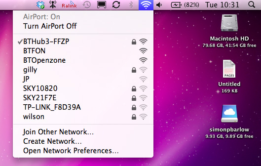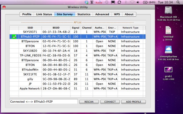 To show the difference, here are a couple of screen shots taken on my laptop when it is sat on the desk at home. The first is using the inbuilt Apple card… it could detect 9 WiFi networks around me….