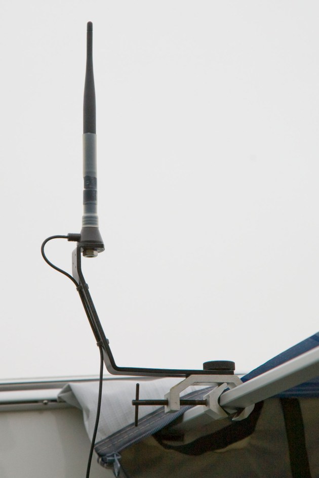 As I mentioned earlier, for use in the caravan, I wanted to be able to locate the antenna outside the van to improve the quality and strength of the signal. I originally purchased a hi-gain magnetic mount antenna from Maplin, and I’ve built a mount that allows me to fasten it to the rail on our Fiamma Caravanstor awning so that it is just above the roofline of the caravan. At marginal locations this makes a huge improvement. It’s not perfect and I’m looking to develop something that will allow me to clip it to an awning rail. (update… I have now made a mount to allow me to fit it to the awning rail).