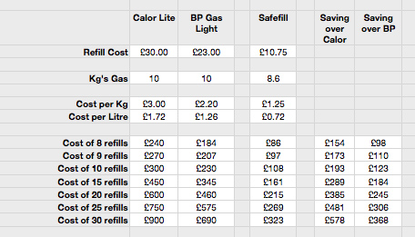 Now, to work out the economics of it. If I went for A Calor Lite or BP Gas Light, I’d have to pay a £30 deposit for the bottle or bottles… or I could put that deposit towards the £150 cost of a Safefill cylinder. I looked at the price of refilling and came up with this little spreadsheet:-