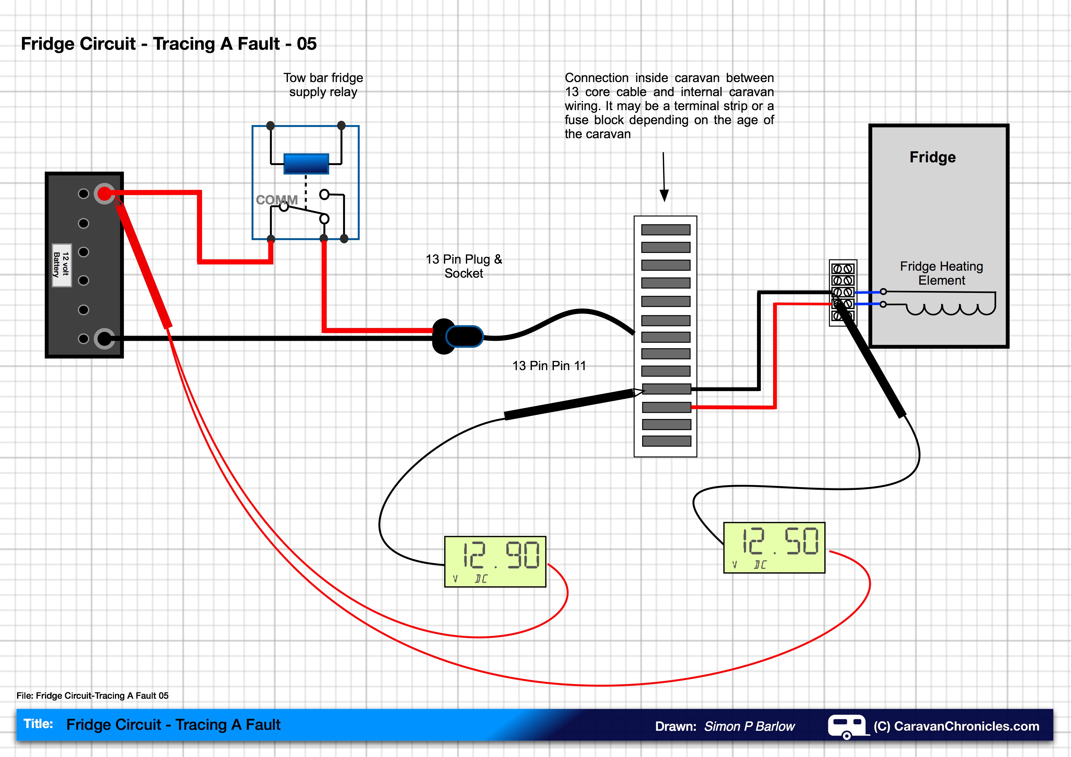We have to look for the biggest voltage drops in any one section. In our example nothing stands out too much although we do have a larger drop between the voltage at pin 11 on the return side of the circuit and the fridge which is 1 volt. So I’d check the connections at the fridge end, the fuse/junction box and in the 13 pin plug.