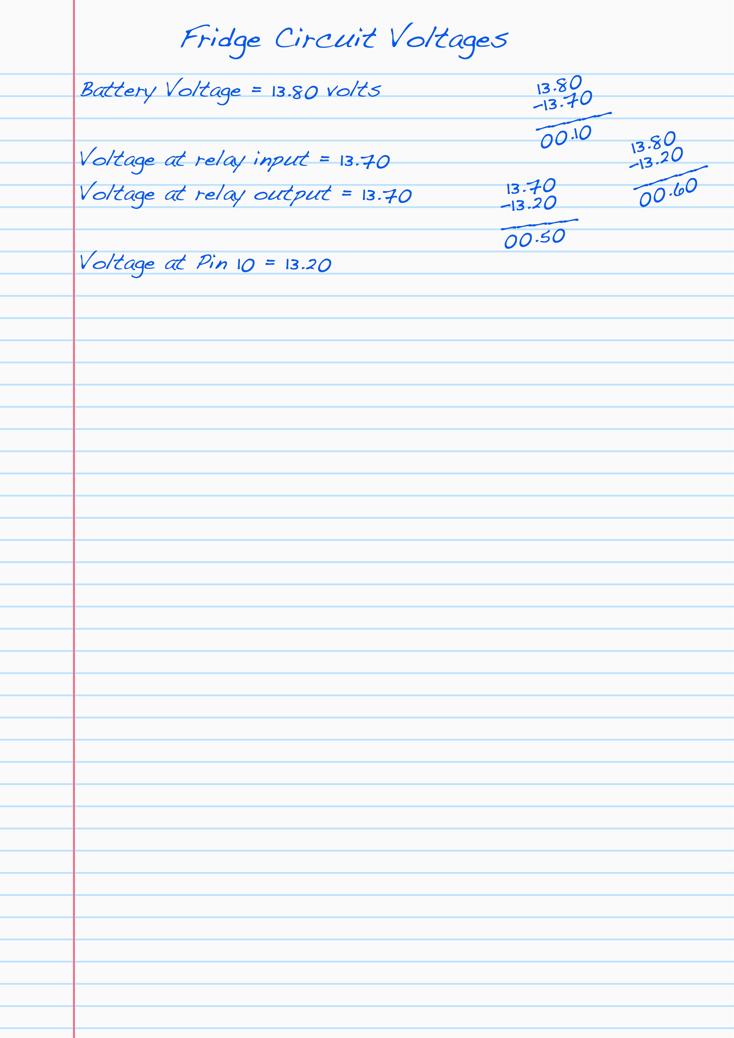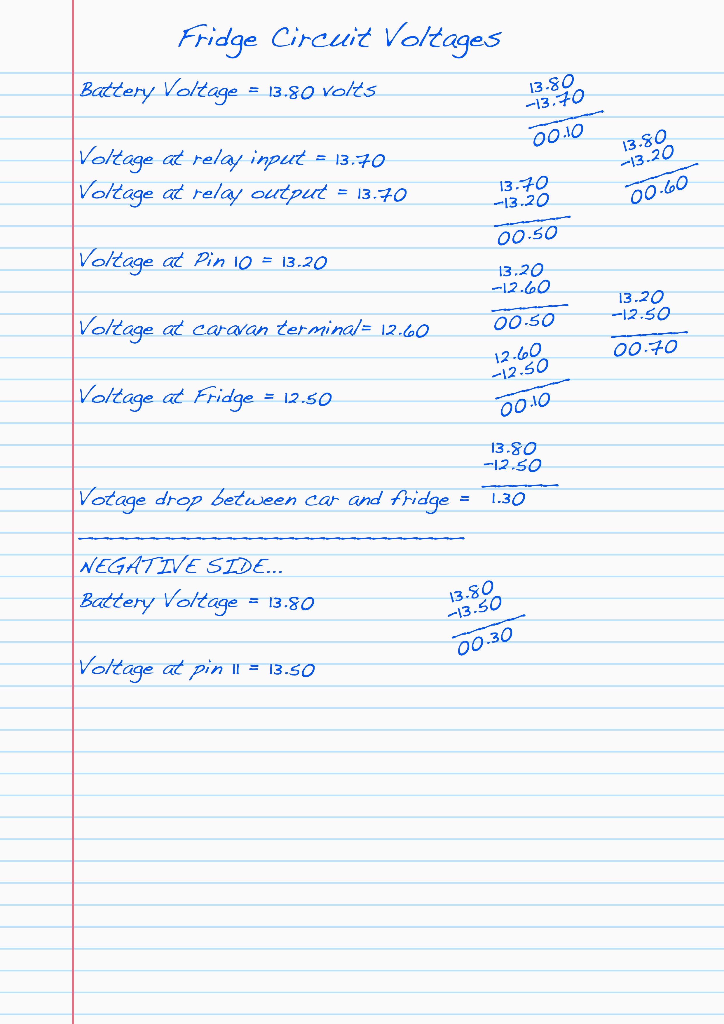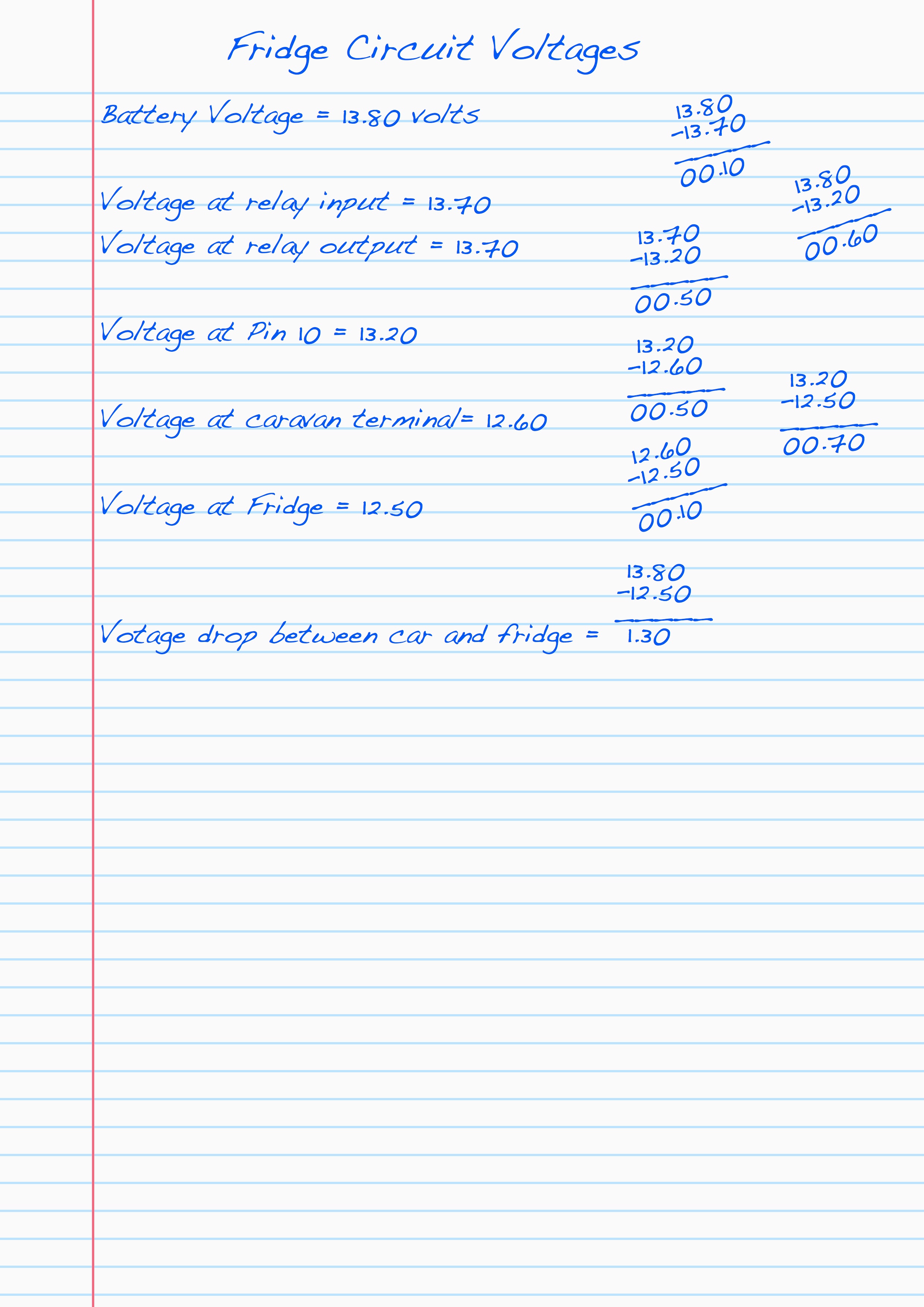 We can see that the voltage drop for the return circuit is also 1.3 volts, therefore for the fridge circuit is loosing 2.6 volts, so if the battery voltage is 13.8 volts the fridge is only getting 11.2 volts.