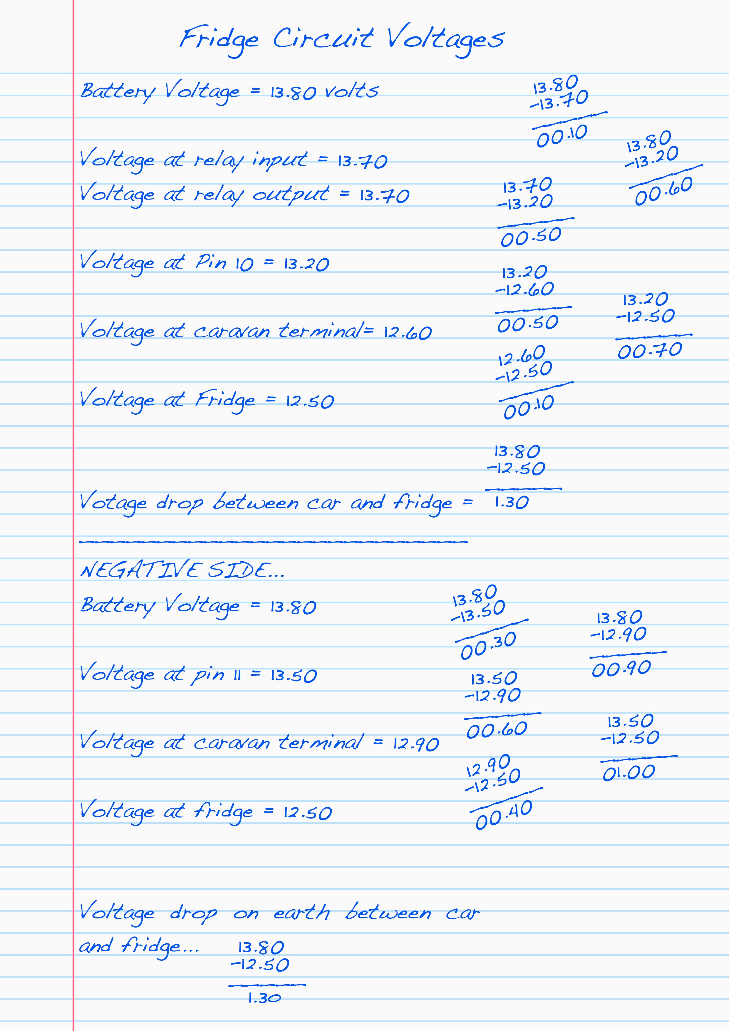 Looking at our notes we can start to quickly work out the voltage drop on the return path of the fridge circuit for the vehicle….