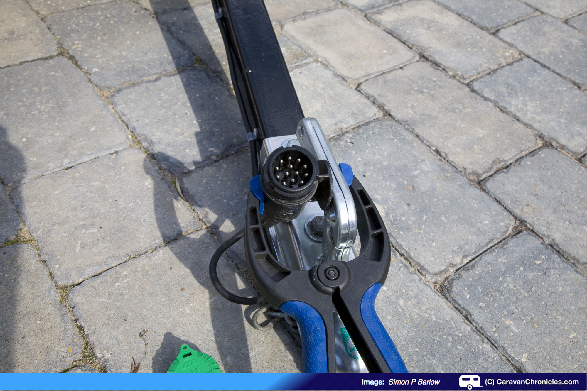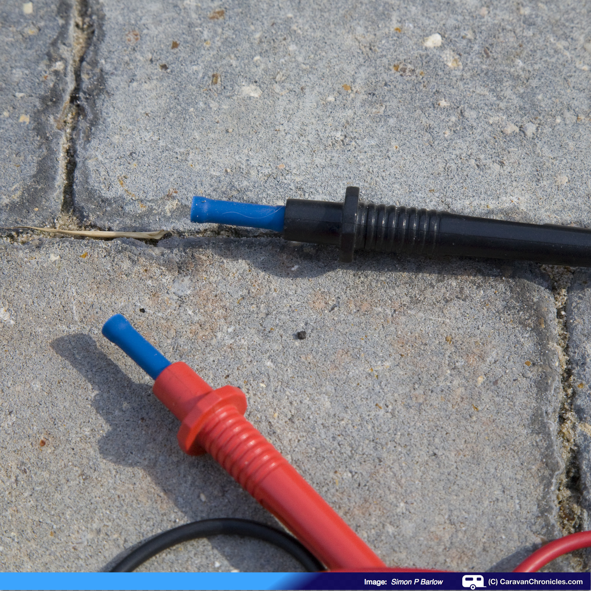 In the photo’s I am testing the road lights on my trailer, so clamped the plug to the hitch handle. On your caravan a good place is to clip it to the hand brake and use the ‘A’ frame fairing to rest your multimeter on. In this instance, it was easier to place it on the ground…..