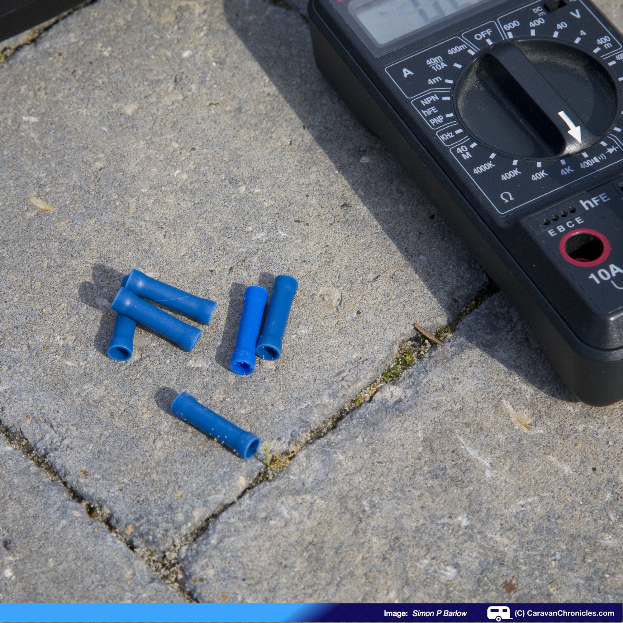 The second trick overcomes the need to be able to hold the points of the multimeter test leads on the end of the pins with the skill of a surgeon. I use a couple of the straight through crimp connectors…… I find the blue size the best.