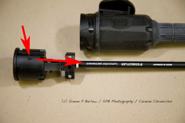 In the picture above, the plug is partly inserted into a socket (this is the same fitting as installed on your car) but I have not rotated the housing yet. If you look closely, you can see I have put a white mark on the housing of the plug and on the rubber cable entry shroud that line up with the writing on the pencil. Now when we turn the housing 90 degrees clockwise to fully connect the plug, look what happens……