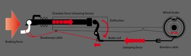 The over-run system is most efficient when you brake in a straight line. If you brake going round a corner, the force transmitted to the over-run system from the towing vehicle is not in a straight line and is actually in two directions (remember the vector representation of forces diagrams from school?) If you want to know a bit more on this read “Understanding the dynamics of towing“