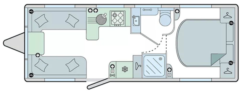 Now I do like this layout… it provides a ‘dinette’ area in a caravan without a dinette. The table can be slid rearwards towards the door on a sliding bar if you need more space on the seat across the front of the caravan.