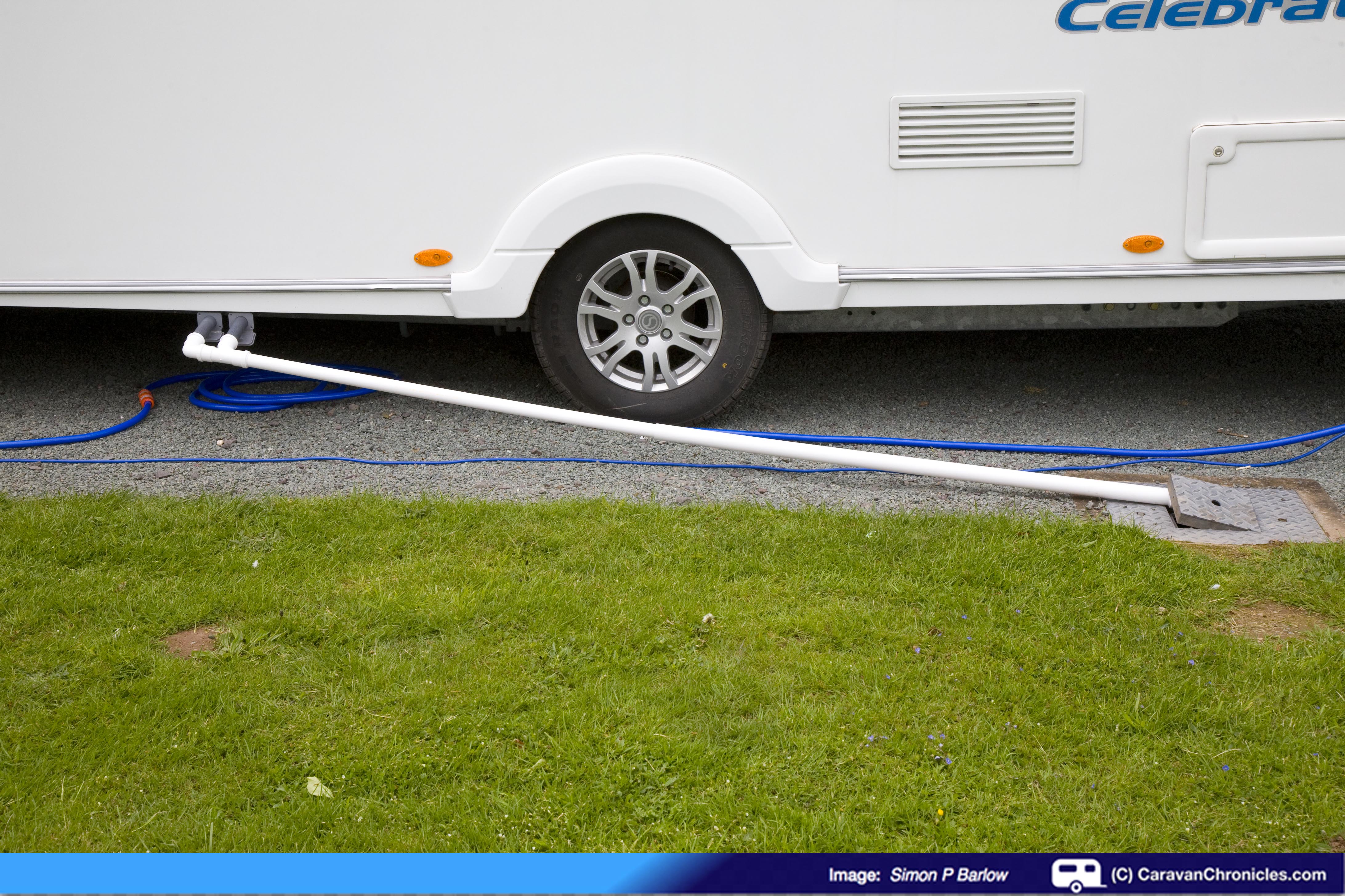 However, a system for the drainage is a little different. The problem is water has an annoying habit of only wanting to flow down hill. Before deciding on how I was going to tackle the drainage for our caravan when on sites, I looked what other people were doing. Nearly all were using a length of the standard grey ribbed flexible hose to connect the Y piece to the drain. This seemed OK if the hose length was one or two metres, but after watching one fellow caravanner keep wrestling with what seemed like a 300 foot length of springy pipe which most of it was just coiled round and round on the ground and every time they did the washing up he had to come out and lift sections of it to drain…. that was the way I didn’t want to go. I would have thought cleaning it afterwards would be a bit of a chore as well.