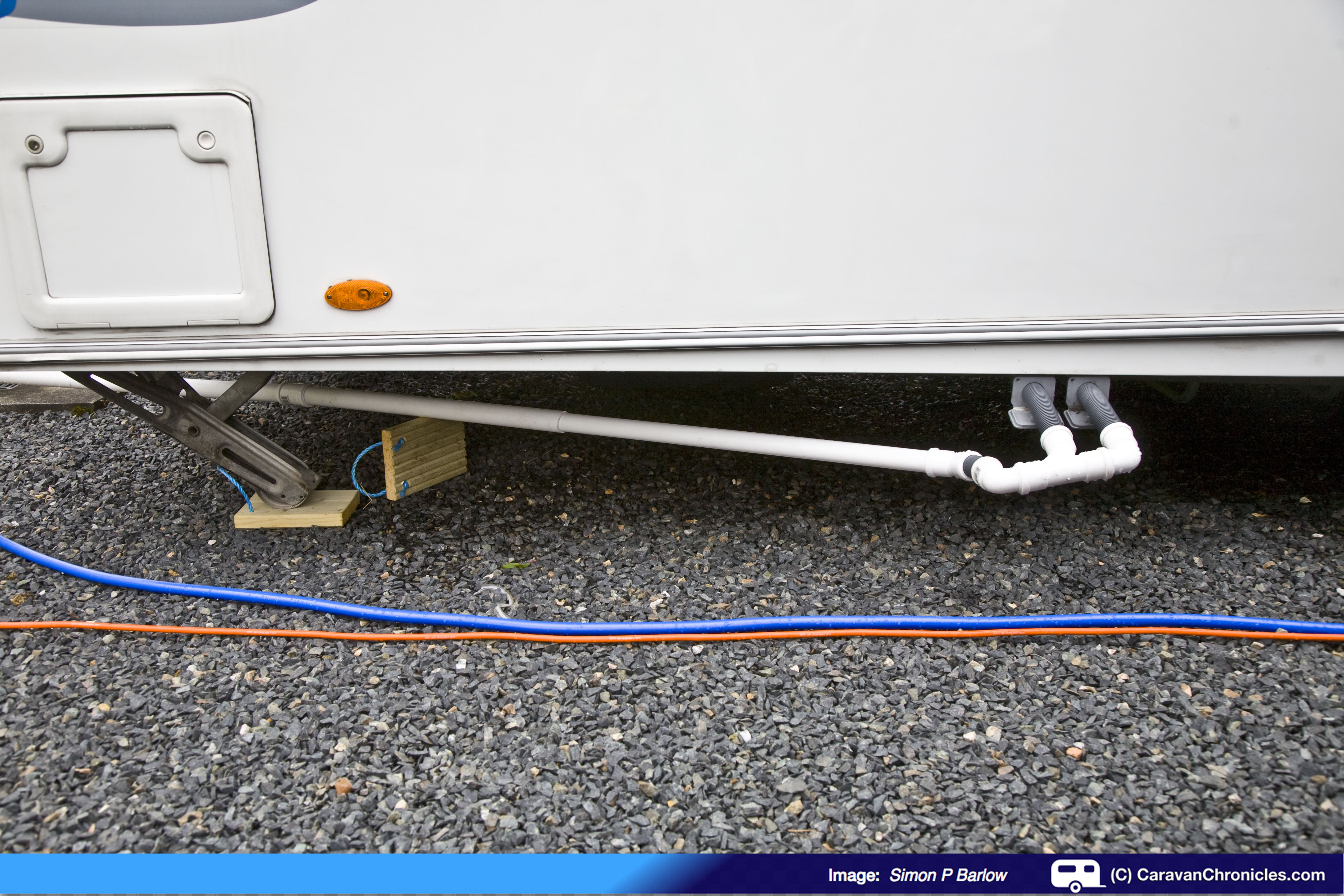 I used the flexible pipes of the ‘Y’ adaptor that came with the caravan to connect up a manifold to join both caravan drain outlets. There is enough flexibility in these pipes to enable the outlet run to be skewed away from the van. I cut the two 3 metre lengths of pipe down so they could easily fit in the gas locker.