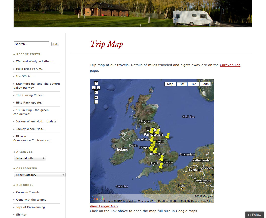 I’ve been pondering on adding a map for a couple of weeks. Somehow looking at where you have been on a map is a bit more memorable and interesting than just looking down a list, well for me it is. I guess though that’s due to the fact that flying and maps are so intertwined I’ve spent so much time in the past pouring over maps for flying in various parts of the world than I have ever done caravanning.