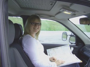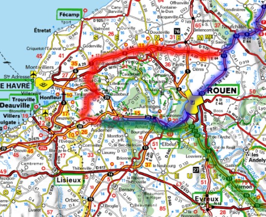 We turned the caravan at an angle by hand, so that it was a quick reverse straight on to the hitch and I didn’t have to have the engine running too long. We coupled up, connected the break-away cable and the 13 pin plug, released the van’s hand brake and jumped in the Freelander. I started the engine and allowed the outfit to roll gently down the slight hill in first gear without any throttle. We crept past Chris and Fran’s van before turning on to the small lane and climbing up the incline to the cross roads. It was 7:18 as we pulled away. Sue had a couple of small bags of rubbish and a bag of empty bottles and a bag of paper for the recycling bin. Rather than stop and use the ones just outside the camping area, we followed the road out and at the next cross roads there were more bins so we stopped and, while Sue tried to silently drop glass bottles into a glass recycling bin, I programmed up the Sat-Nav…. “Camping Risle Seine”….”fastest route”…. “accept toll roads”…….. “planning route – 716 Km to go”.