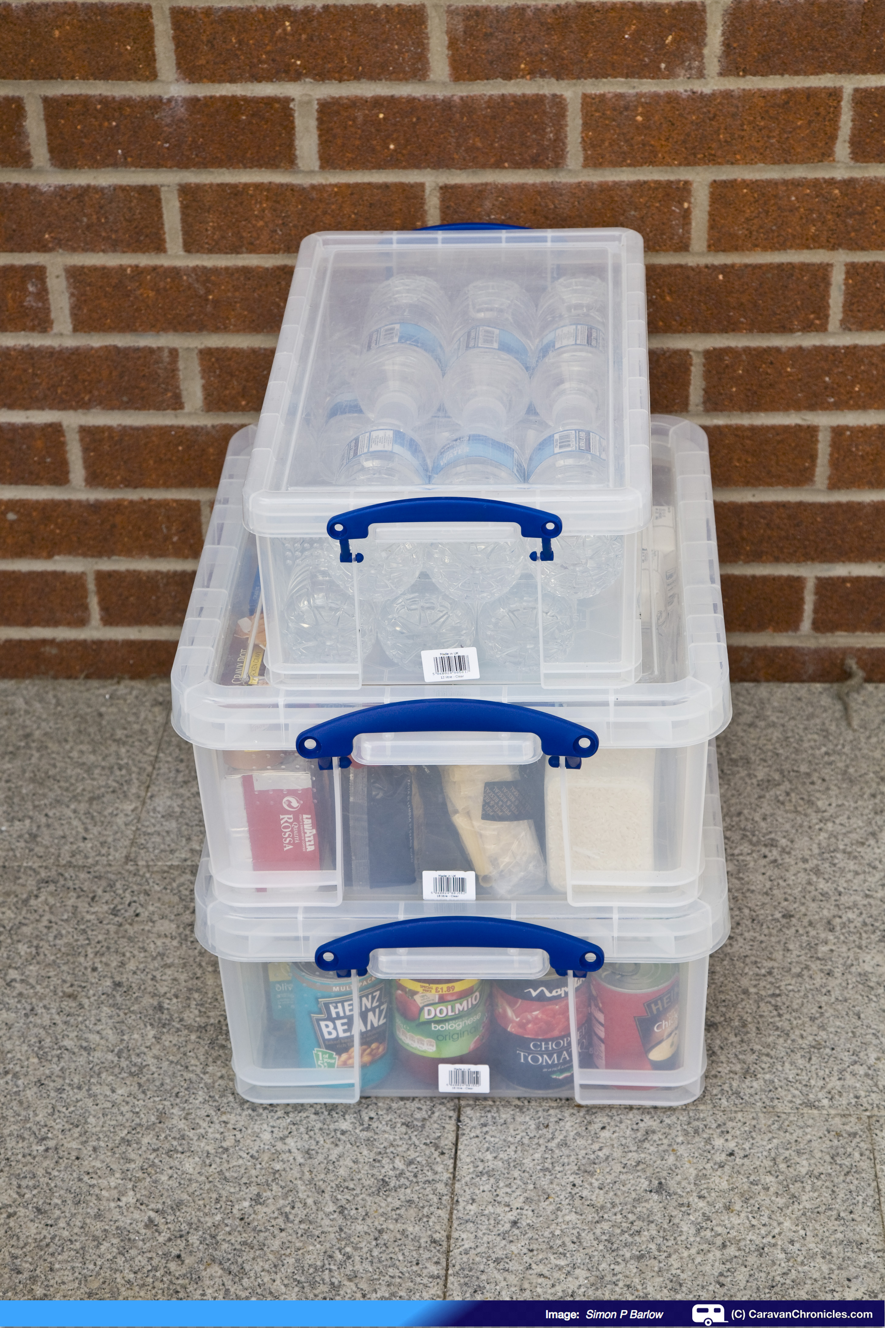 We came up with a list of essential items that we take, mostly things that we need when cooking and core ingredients. All these are stored in plastic boxes at home ready to go. Storing them at home means we can keep an eye on expiration dates and restock from a list when required. The boxes are from The Really Useful Box Co so they stack neatly and fit in the back of the Land Rover Freelander easily. They also contain things that we can use to make a few hot meals if we get delayed en-route (I’ve never had to make a meal while held up in a traffic jam for hours on the motorway… not yet anyway!)